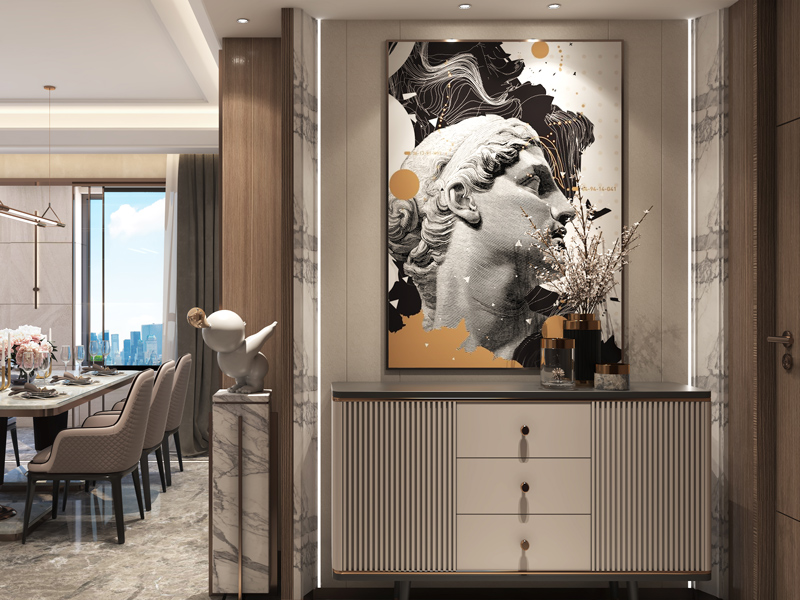玄关区域一幅艺术挂画提升视觉时尚感,灯带设计提升区域氛围感,增设收纳柜满足区域储物需求。