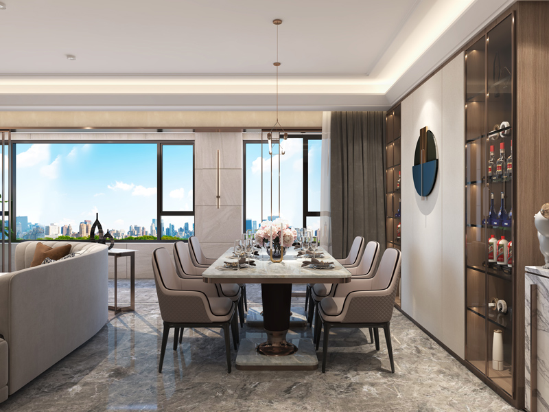 餐厅区域布局在客厅的后侧,整体更饱满避免空旷,连贯的风格设计使客餐厅融为一体,和谐统一。