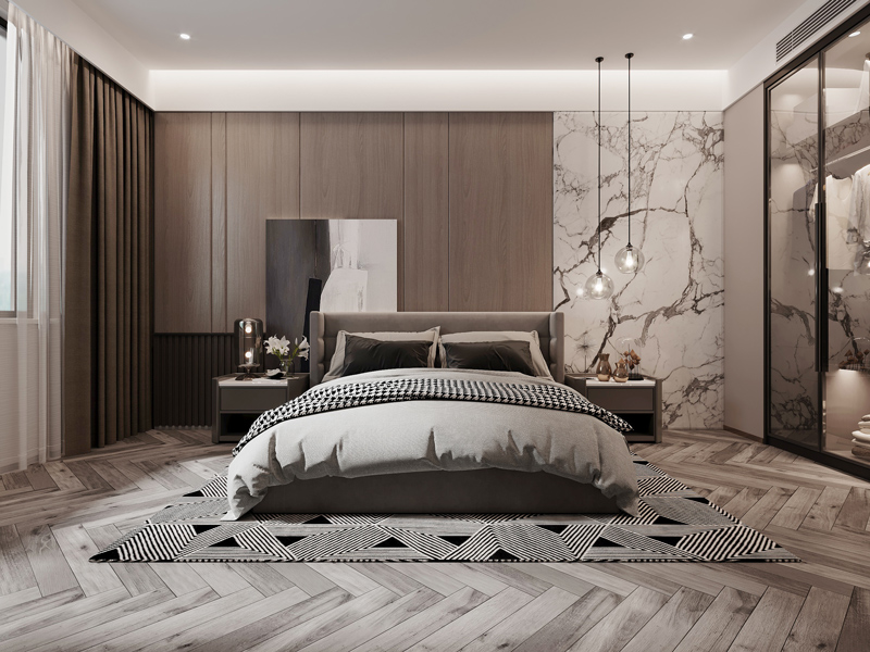 卧室背景墙采用自然的木饰面与大理石碰撞,呈现大方流畅富有自然气息,无主灯设计光线柔和提升睡眠质量。