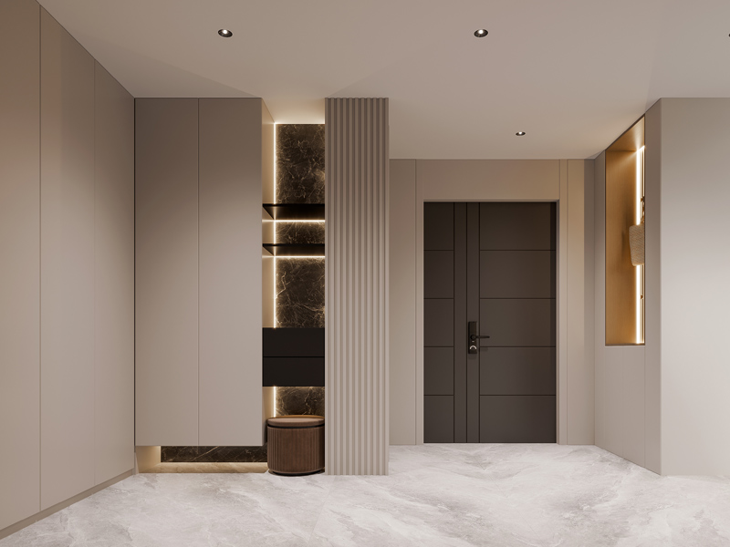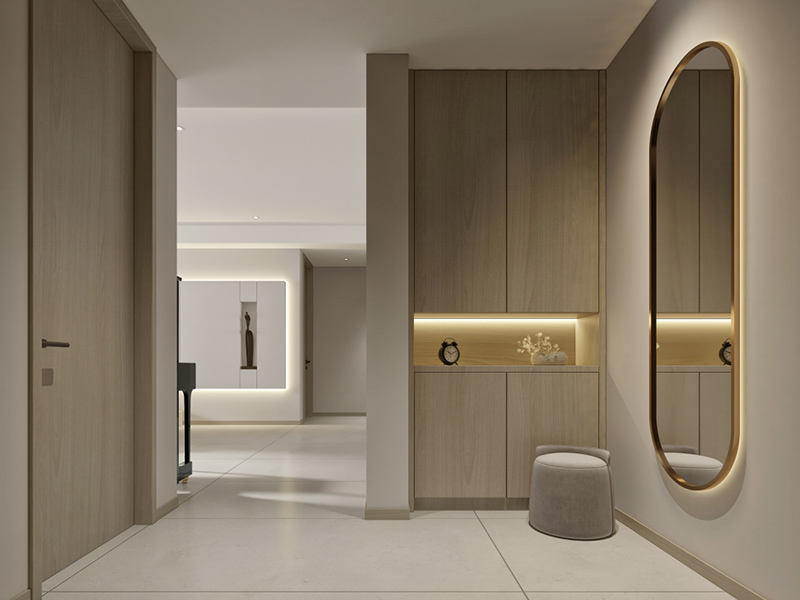 以更大化的利用空间为核心,采用整墙定制高柜设计,垂直空间直达天花板,内部通过分层、分区满足鞋履、换季杂物等各类收纳需求。适合收纳需求旺盛的家庭,小户型可选择嵌入式或壁挂式减少压抑感。