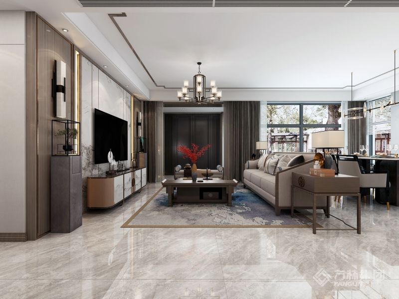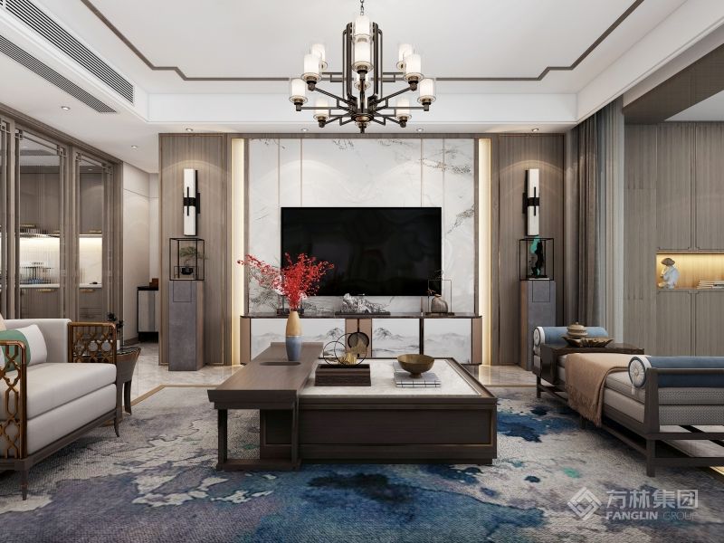 利用明清家具风格融合现代风格的硬装,采用传统木质颜色,以及软装颜色形成了新中式风格