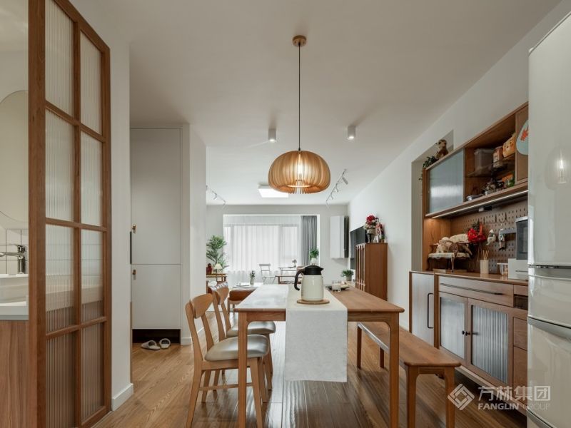 "餐厅选择的是北欧表情的一套樱桃木餐桌椅,用长凳代替一侧的餐椅,更节省空间,并且视觉上更通透。 二黑木作的经典款餐边柜,平常用于收纳零食、杯子等,中间洞洞板区域可以挂一些类似剪刀、胶带等常用工具。"