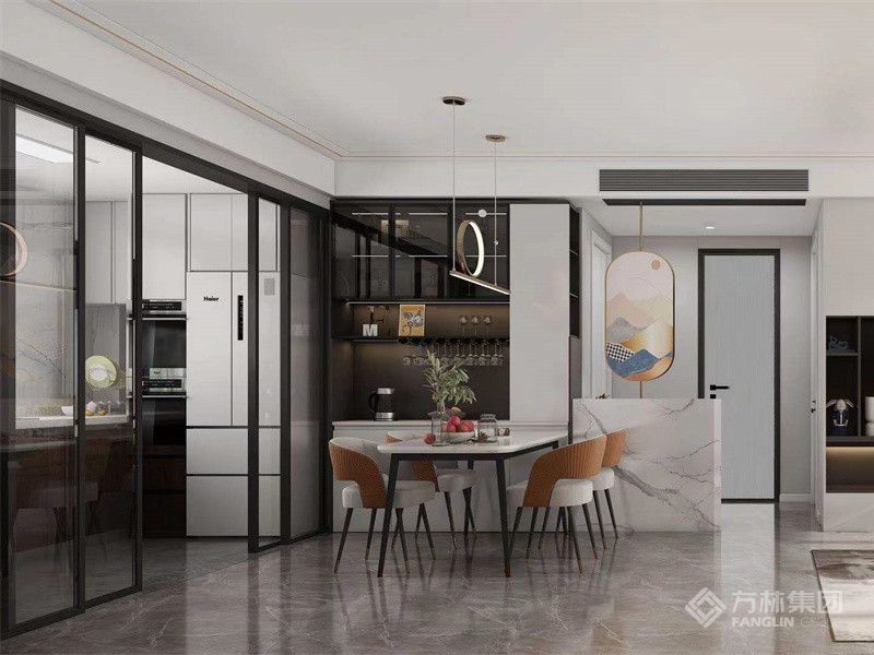 本案为现代简约风格,考虑业主的需求,卫生间干湿分离,南边次卧室为儿童房,客餐厅保留原始功能分区做成敞开客厅和餐厅,更显通透预留主卧室储物空间阳台打通纳入客厅空间,厨房移门采用4联动移门,提高空间延伸感。