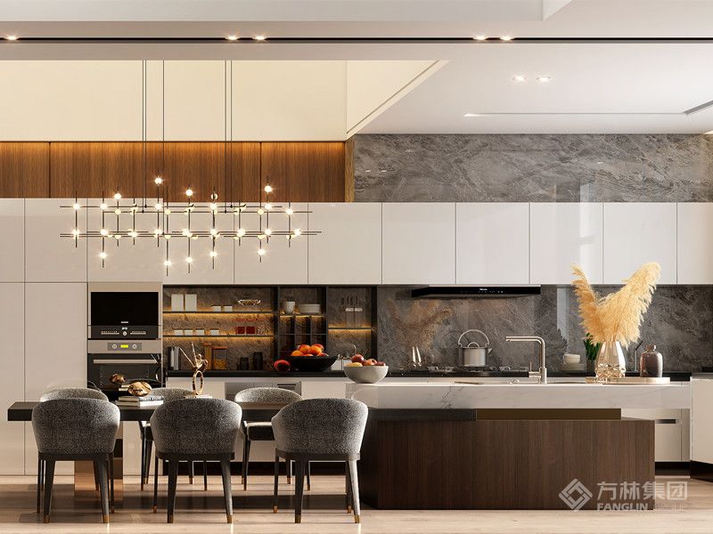 客餐厅整体的灯光基调较为温馨,简洁素白的色彩搭配给予灯光更多的发挥空间。造型灯饰作为整个空间的点缀,彰显空间格调。