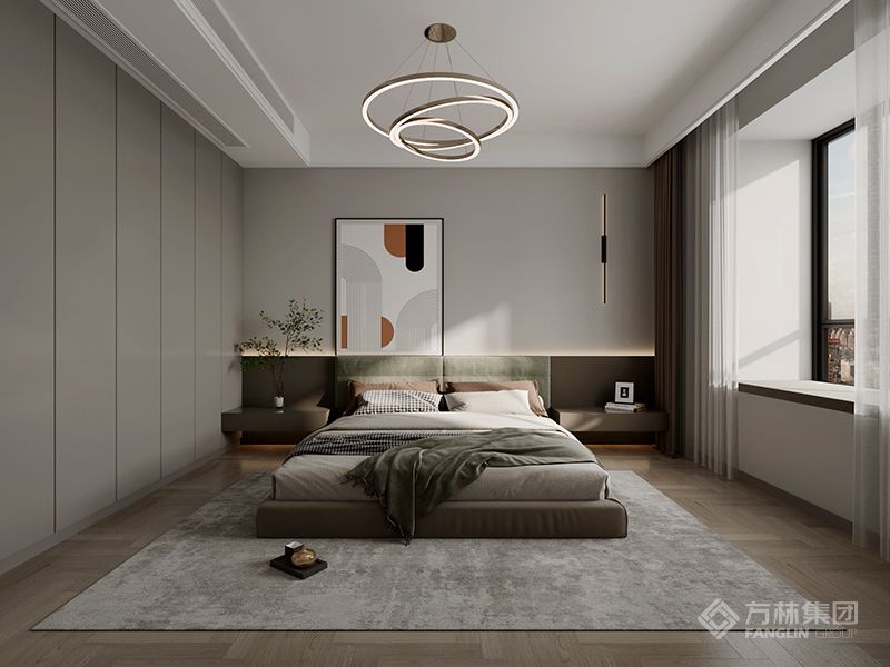 主卧背景与客厅类似做了墙板,壁灯使深色格栅不沉闷