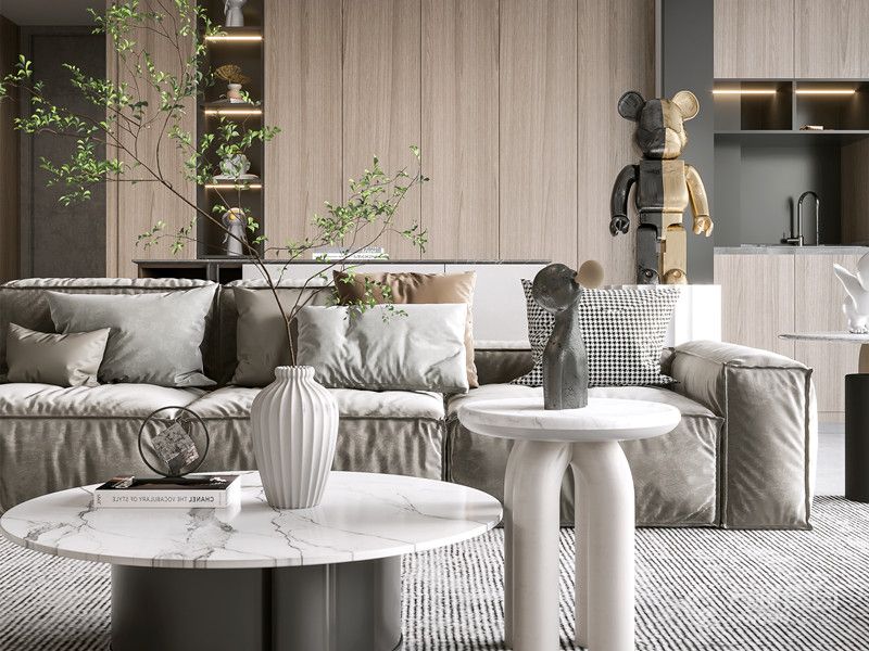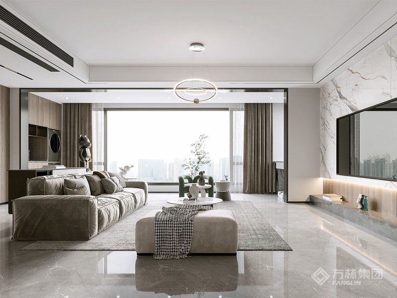 大横厅通铺一米八瓷砖,金属极窄边框跟中性暖色的木质配色,家里常住两口人还是比较喜欢干净温暖。