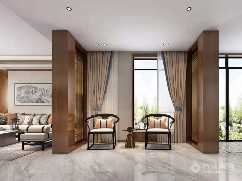 设计师对于中式的借景手法一直颇为喜欢,所以在做整个案子的时候首先考虑前厅如何取景让景色进入室内,书房的借景也是同样的道理,整个案子最大的特色就是茶室多,所以在做方案的时候与普通住宅有所区别。
