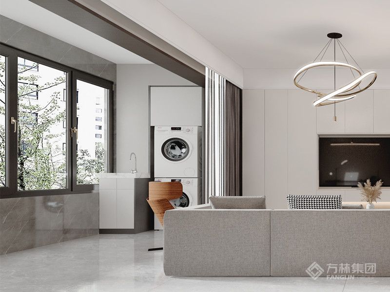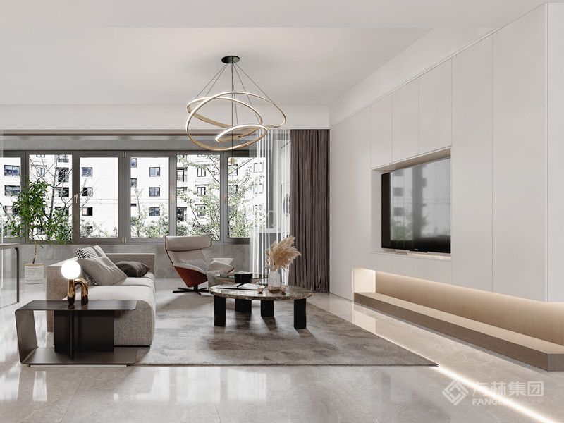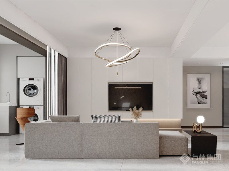 原始户型是三室两厅一厨两卫,目前夫妻二人居住、不用太多房间、保留儿童房和客房就满足未来五至七年的需求、所以横厅显得更为宽阔、可以多一个敞开式书房、功能性更多、也增加了客厅的氛围感
