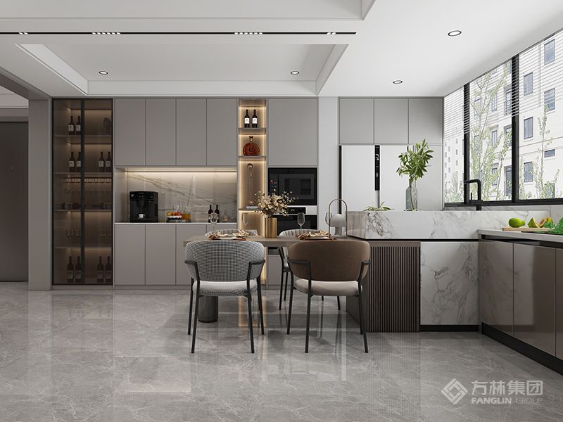 开放式厨房,空间开阔,镜面柜门,水磨石材料的运用使空间灵动。