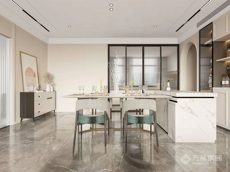 白色的餐桌与棕色亚克力餐椅搭配,再加一点点灰着色,仿佛参加一场流光溢彩的晚宴,你不必盛装,因为这里不论身份出席,却知道有美味佳肴呈上。这就是色彩的魅力,明显不在同一维度的颜色,却会因巧妙的碰撞,呈现出