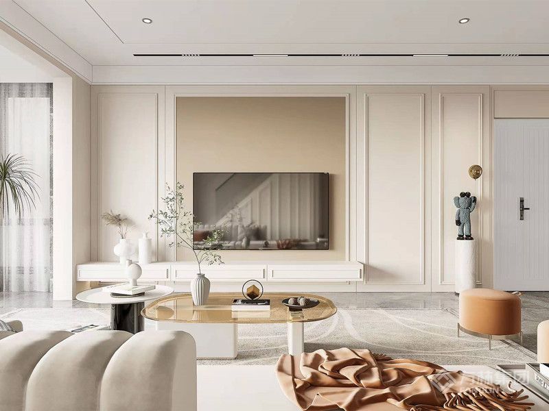 浪漫的法式不只拘于实用,还要有质感与设计腔调。所以,先用围合式的沙发摆放确定功能的互动表达,再用胡桃木的木作造型与白色柜体碰撞,兼具收纳与艺术。