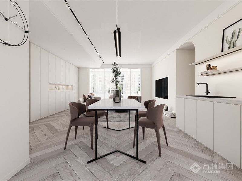 为空间刷上纯白,白色会把光线反射晕染至每个角落,视觉上空间会更加的开阔,点缀的木色使空间如谦谦君子一般,温润如玉。打造悠然自得的生活境界,低调不张扬,温润又克制 。