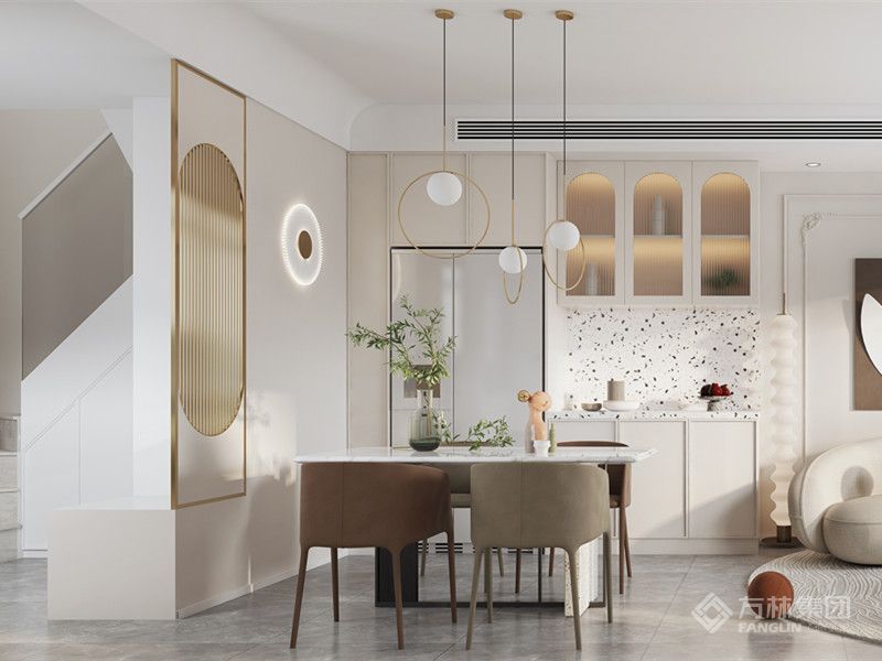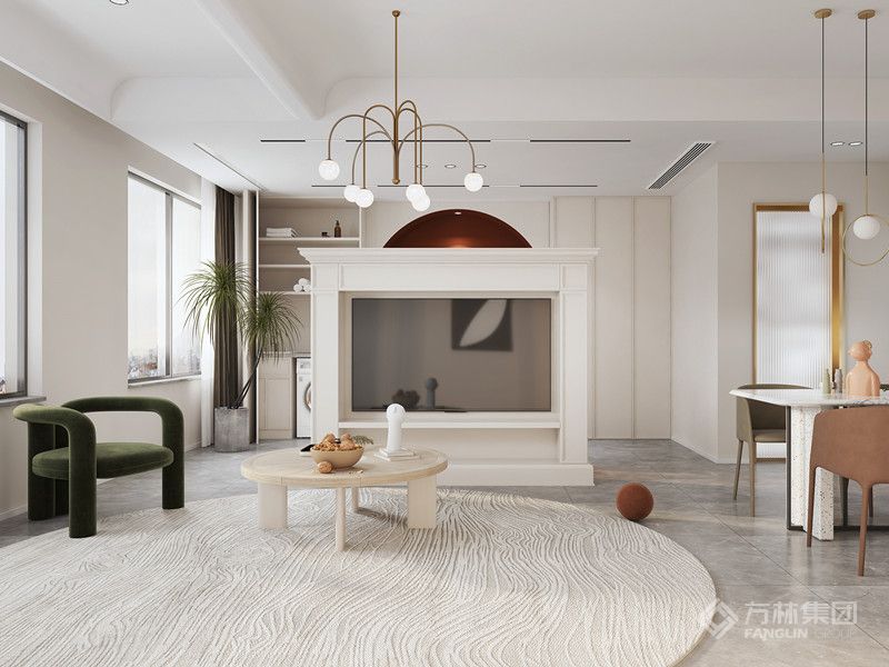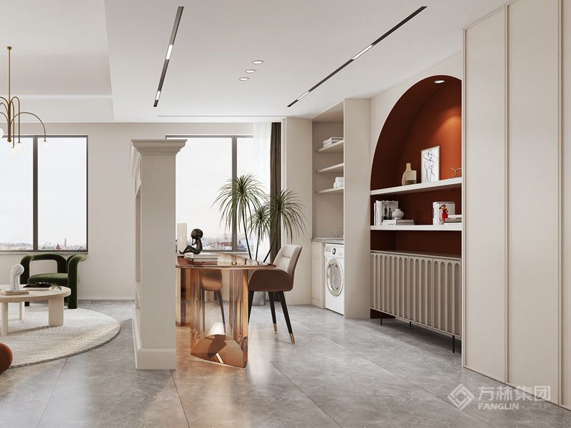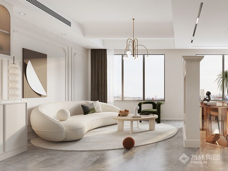 女主人是个白衣天使——护士。喜欢简洁法式的感觉,所以设计师以法式的轻柔色调和线条来体现,梁的突兀用弧形吊顶来化解,客餐厅和书房一个通透的造型,使整体空间更为舒适大气。洗衣烘干巧妙放在储物收纳柜里,美观而实用。整体的弧形造型,交相呼应,秀美柔和,别有法式风情。